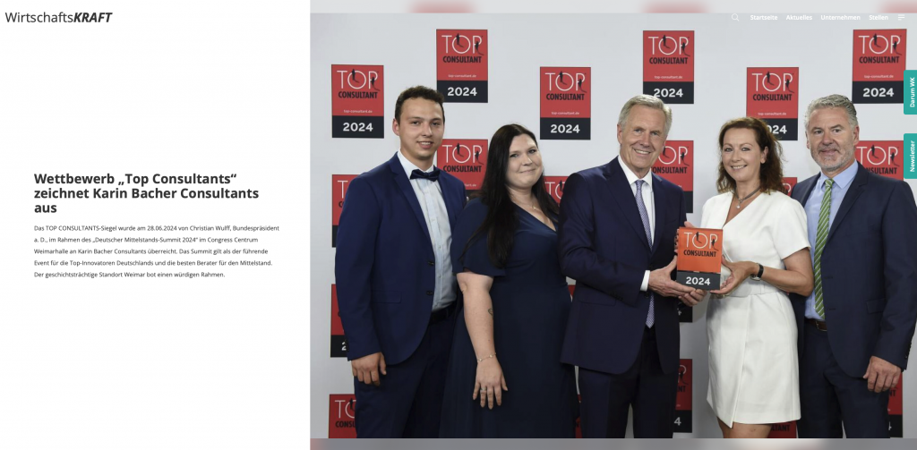 Top Consultant – Ausgezeichnet als einer der besten deutschen Berater Das TOP CONSULTANTS-Siegel wurde am 28.06.2024 von Christian Wulff, Bundespräsident a. D., im Rahmen des „Deutscher Mittelstands-Summit 2024“ im Congress Centrum Weimarhalle an Karin Bacher Consultants überreicht. Das Summit gilt als der führende Event für die Top-Innovatoren Deutschlands und die besten Berater für den Mittelstand. […]