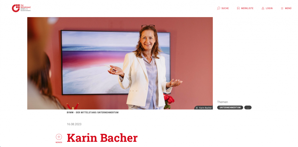 Interview mit Karin Bacher für „starke Frauen – Starker Mittelstand“ BVMW Die Geschäftsführerin von Karin Bacher Consulting & Coaching e. K. im Interview für die Initiative „Starke Frauen – Starker Mittelstand“ auf der Website vom BVMW Deutschland. „Wie sind Sie dazu gekommen, Unternehmerin zu werden? Mit dem Gedanken spielte ich bereits während meiner Ausbildung. Nach […]