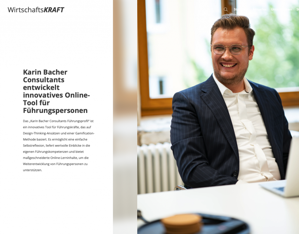 WirtschaftsKRAFTplus – Karin Bacher Consultants entwickelt innovatives Online-Tool für Führungspersonen Das „Karin Bacher Consultants Führungsprofil“ ist ein innovatives Tool für Führungskräfte, das auf Design-Thinking-Ansätzen und einer Gamification-Methode basiert. Es ermöglicht eine einfache Selbstreflexion, liefert wertvolle Einblicke in die eigenen Führungskompetenzen und bietet maßgeschneiderte Online-Lerninhalte, um die Weiterentwicklung von Führungspersonen zu unterstützen. Hier geht es zum […]