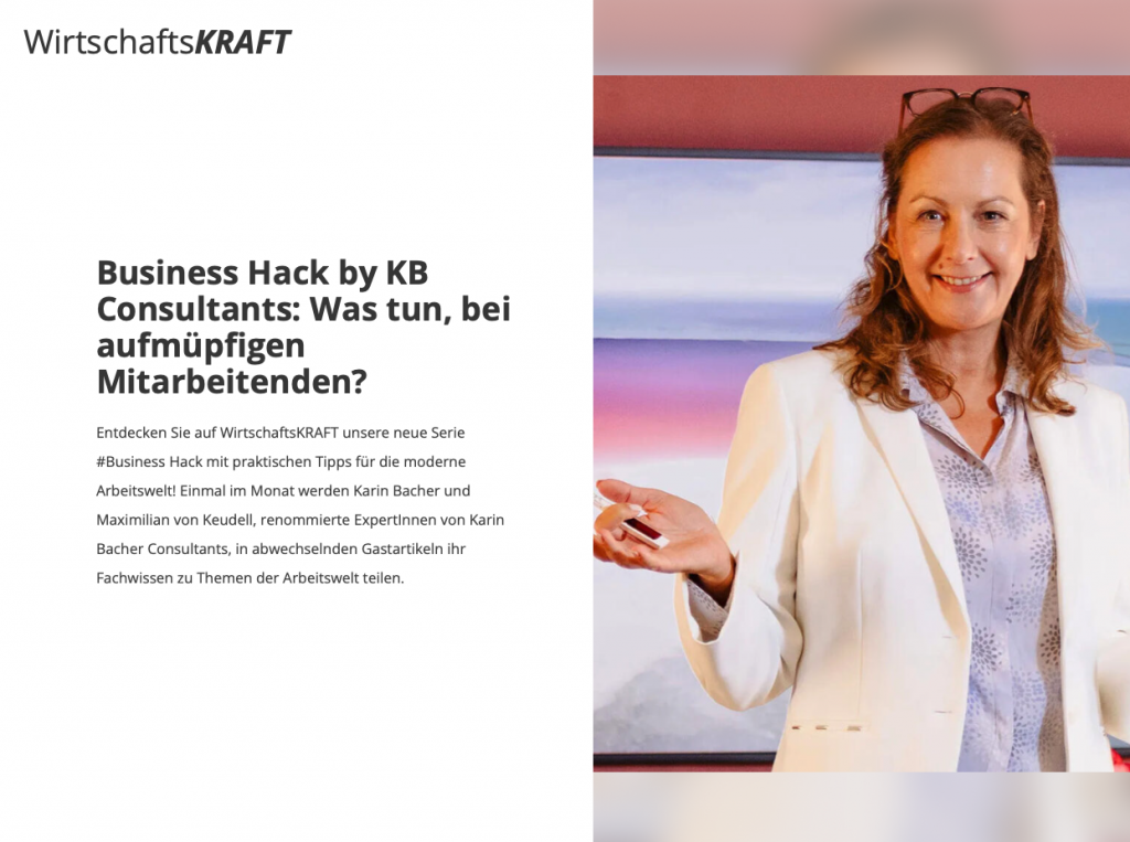 WirtschaftsKRAFTplus – Business Hack by KB Consultants: Was tun, bei aufmüpfigen Mitarbeitenden? Entdecken Sie auf WirtschaftsKRAFT unsere neue Serie #Business Hack mit praktischen Tipps für die moderne Arbeitswelt! Einmal im Monat werden Karin Bacher und Maximilian von Keudell, renommierte ExpertInnen von Karin Bacher Consultants, in abwechselnden Gastartikeln ihr Fachwissen zu Themen der Arbeitswelt teilen. Hier […]