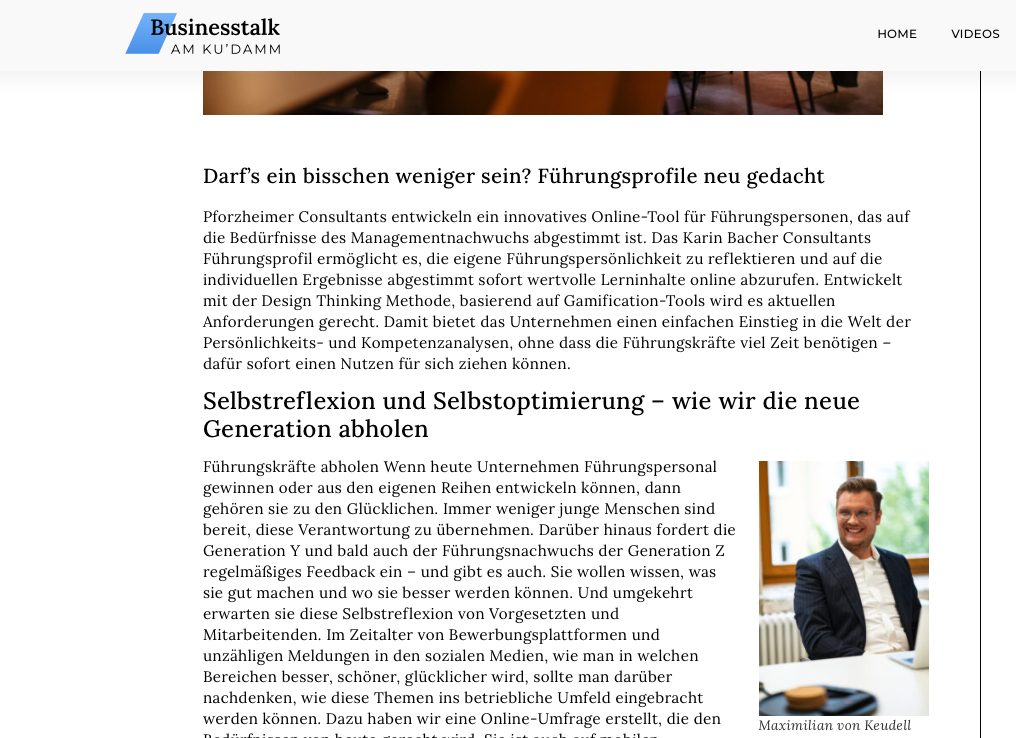 Businesstalk am Ku’damm – Darf’s ein bisschen weniger sein? Führungsprofile neu gedacht Pforzheimer Consultants entwickeln ein innovatives Online-Tool für Führungspersonen, das auf die Bedürfnisse des Managementnachwuchs abgestimmt ist. Das Karin Bacher Consultants Führungsprofil ermöglicht es, die eigene Führungspersönlichkeit zu reflektieren und auf die individuellen Ergebnisse abgestimmt sofort wertvolle Lerninhalte online abzurufen. Entwickelt mit der Design […]