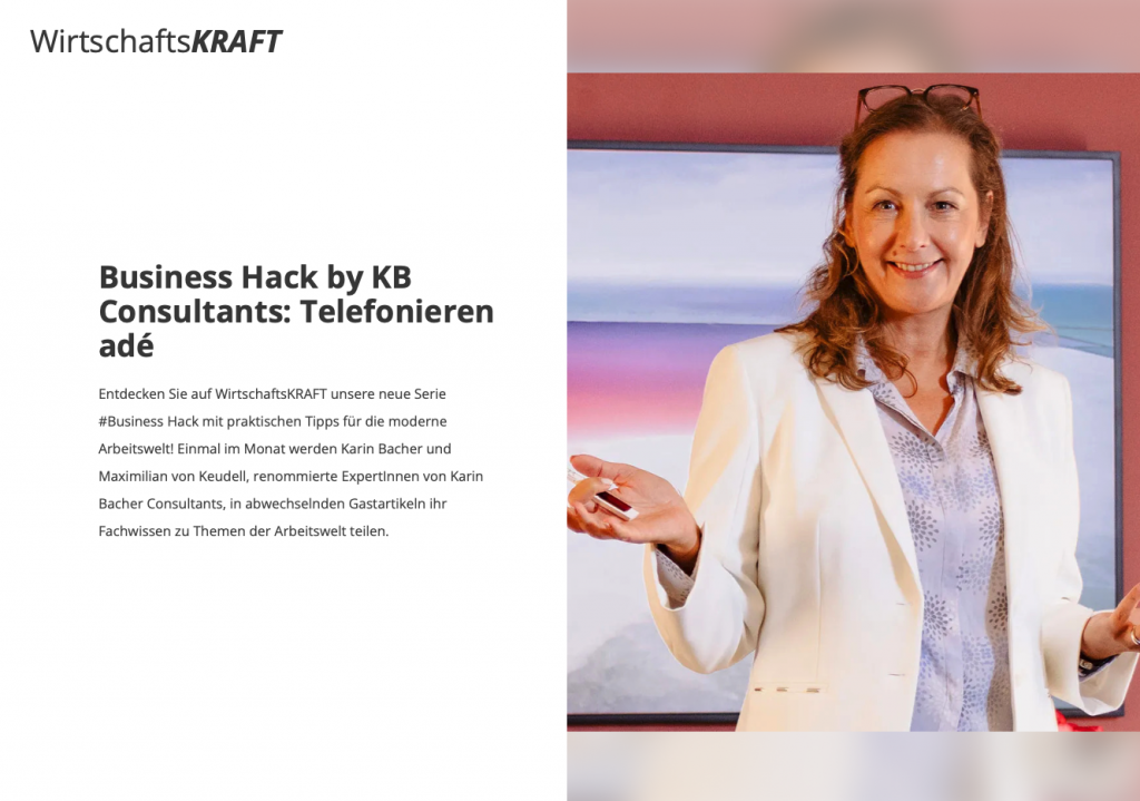 WirtschaftsKRAFTplus – Business Hack by KB Consultants: Telefonieren adé Entdecken Sie auf WirtschaftsKRAFT unsere neue Serie #Business Hack mit praktischen Tipps für die moderne Arbeitswelt! Einmal im Monat werden Karin Bacher und Maximilian von Keudell, renommierte ExpertInnen von Karin Bacher Consultants, in abwechselnden Gastartikeln ihr Fachwissen zu Themen der Arbeitswelt teilen. Hier geht es zum […]