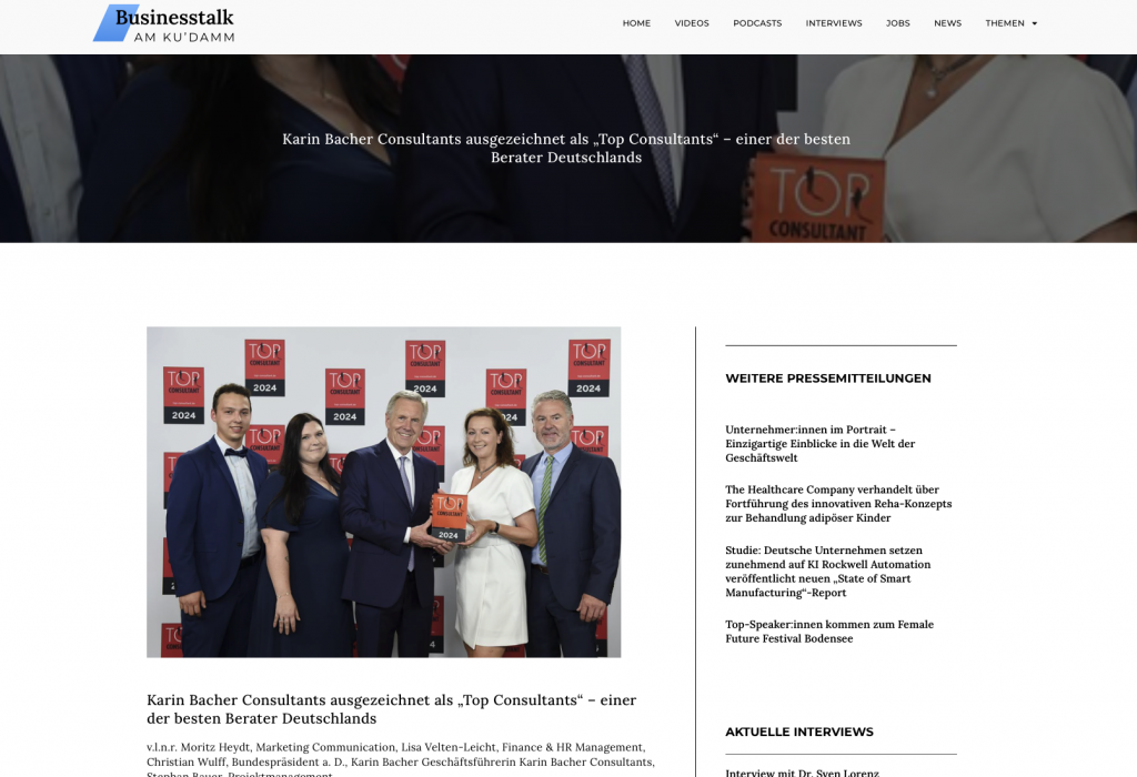 Businesstalk am Ku’damm – Auszeichnung als Top Consultants Karin Bacher Consultants ausgezeichnet als „Top Consultants“ – einer der besten Berater Deutschlands Seit 2010 zeichnet der Wettbewerb TOP CONSULTANTS jährlich die besten Berater für mittelständische Unternehmen aus. Entscheidend für die Auszeichnung mit dem Qualitätssiegel TOP CONSULTANT ist eine kundengerechte, mittelstandsorientierte Beraterleistung. Karin Bacher Consultants erhalten diese […]