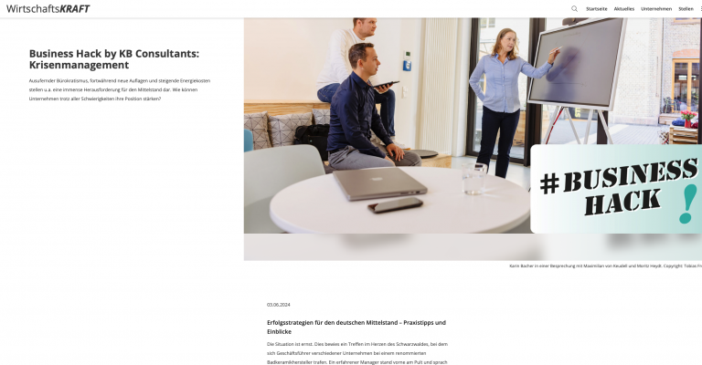 WirtschaftsKRAFTplus – Business Hack by KB Consultants: Krisenmanagement Entdecken Sie auf WirtschaftsKRAFT unsere neue Serie #Business Hack mit praktischen Tipps für die moderne Arbeitswelt! Einmal im Monat werden Karin Bacher und Maximilian von Keudell, renommierte ExpertInnen von Karin Bacher Consultants, in abwechselnden Gastartikeln ihr Fachwissen zu Themen der Arbeitswelt teilen. Hier geht es zum Artikel des Magazins WirtschaftsKRAFTplus.