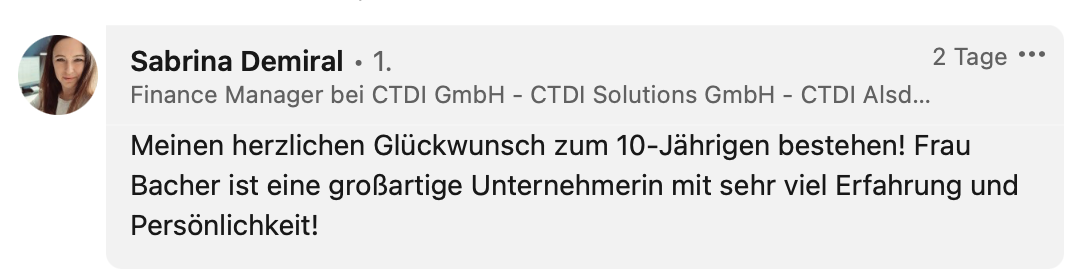 „In einer wichtigen Phase unserer Unternehmensentwicklung hat uns Karin Bacher mit außergewöhnlichem Engagement und beeindruckender Methodenkompetenz begleitet. Unser junges Managementteam stand vor komplexen Herausforderungen und erhielt nicht nur Beratung, sondern eine echte Partnerin auf Augenhöhe.